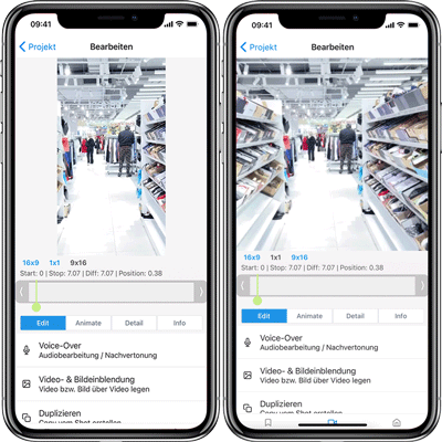 Generieren Sie durch abgestimmte/hinterlegte Vorlagen weitere optimierte Formate (1:1, 9:16), ohne zusätzlichen Produktionsaufwand! Durch einen integrierten Tracking-Modus setzen Sie Ihren gewünschten Bildausschnitt. Damit ist ein optimales Multiformat gewährleistet.