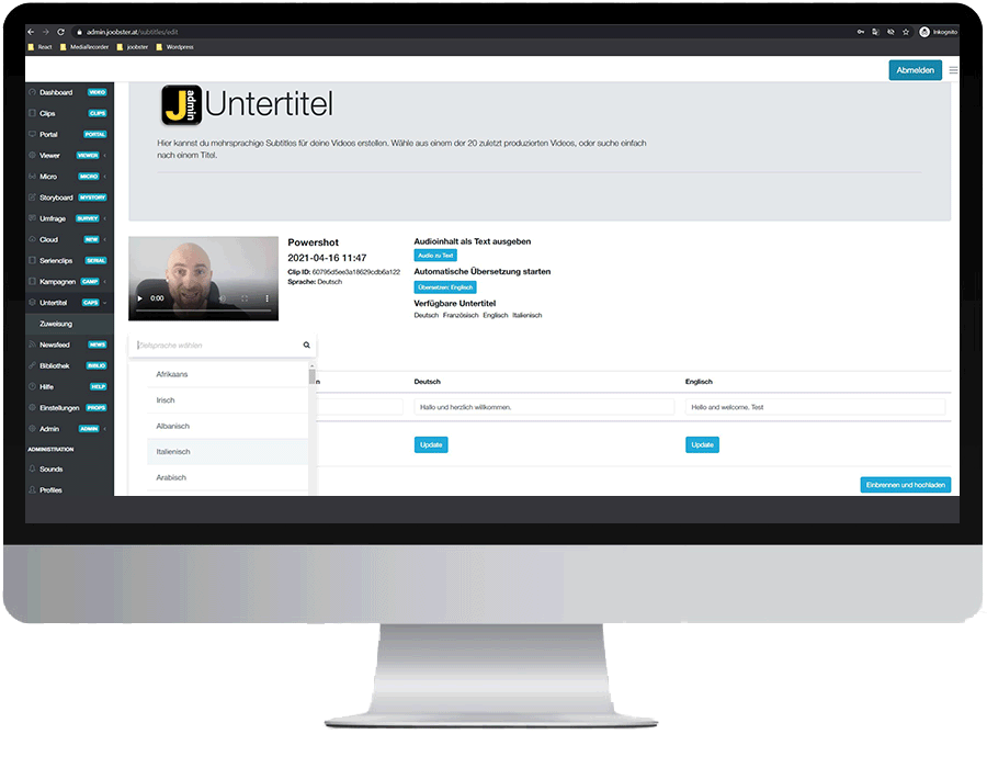 Extrahieren Sie aus Ihrem Video den gesprochenen Text. Wählen Sie aus den unterschiedlichen Zielsprachen und übersetzen Sie automatisch Ihre Texte. Sie können jederzeit eine manuelle Überarbeitung vornehmen. ``Brennen`` Sie so die Texte als Untertitel in Ihr Video. Ihnen stehen 2 Möglichkeiten zur Verfügung: 1) Für jede Sprache wird ein separates Video erstellt, wobei die Untertitel direkt ins Video eingebrannt werden 2) Die Untertitel stehen Ihnen als Auswahl im Video zur Verfügung. Aber Vorsicht! Dies muss vom Web-Videoplayer unterstützt werden!