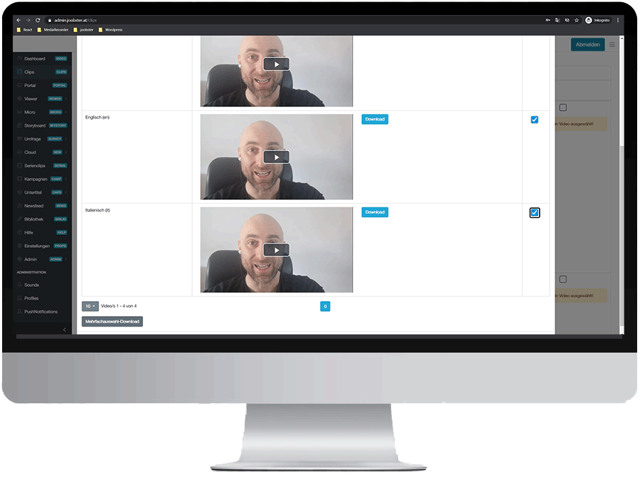 Laden Sie Ihre Videos in der joobster admin - Verwaltung über den Reiter ``Clips`` herunter, entweder einzeln, oder als Mehrfachselektion!
